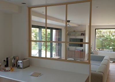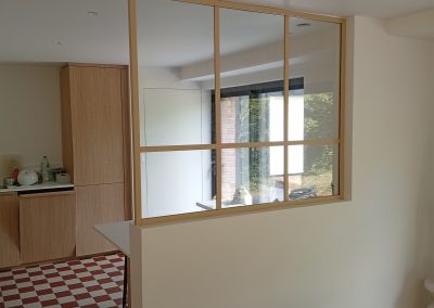 Les menuiseries devant être fixées sur des supports solides, nous avons renforcé la cloison en ajoutant une structure bois derrière le placo afin d’assurer une stabilité et une durabilité optimales.